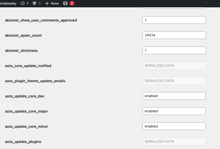 Nesta tela, se vê uma lista em ordem alfabética com todos os registro da tabela wp_options, que guarda praticamente todas as opções referentes à personalização do seu website, incluindo ajustes de plug-ins e configurações próprias.